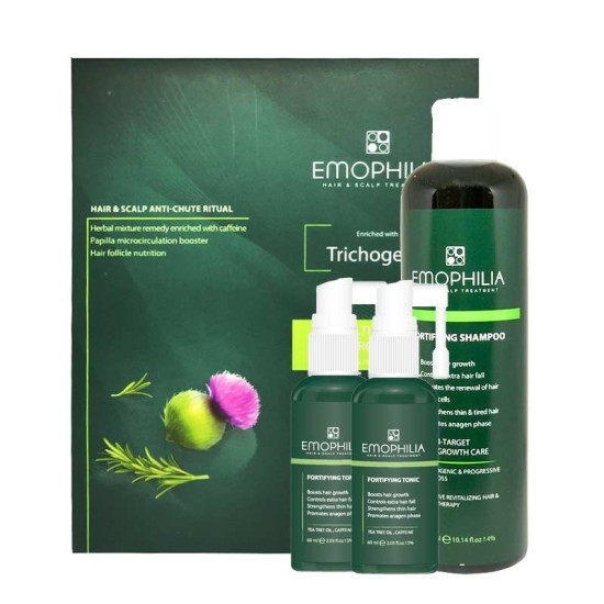 تاثیرات تریکوژن برای سلامت موها: تریکوژن اموفیلیا باعث افزایش رگ زایی اطراف پیاز موها شده و بدین واسطه باعث بهبود خونرسانی به ناحیه پاپیلای مو می شود. این مزیت می تواند به واسطه وجود جینسینگ و آمینو اسید آرژنین اتفاق بیافتد. همچنین با افزایش خونرسانی به فولیکول های مو، متابولیسم سلولی فولیکول مو بهبود داده شده و اکسیژن رسانی نیز به آنها بیشتر می شود. وجود ترکیبات طبیعی در پکیج شامپو و تونیک ضد ریزش تریکوژن اموفیلا باعث افزایش استحکام تار مو به واسطه مهار آنزیم سرین پروتئاز می شود. آنزیم سرین پروتئاز مسئول افتادن تار مو از ناحیه پاپیلا در فاز تلوژن است. با مهار این آنزیم، ریزش مو کاهش پیدا کرده و مو فرصت تغذیه از مواد و ترکیبات این پکیج را خواهد داشت. وجود ترکیبات آبرسان و مرطوب کننده در تریکوژن باعث بهبود وضعیت پوست کف سر و همچنین بهبود حالت پذیری موها و شانه پذیری موها می شود. همچنین وجود زینک و سایز ترکیبات موثر در تریکوژن اموفیلیا باعث کنترل چربی موها و کف سر شده و باع مهار ریزش های هورمونی به واسطه مهار آنزیم 5-آلفاردوکتاز به جلوگیری از ریزش مو کمک می کند. ترکیبات پیکج ترکیوژن می تواند به خوبی به جلوگیری از شوره موها نیز کمک کند. تاثیرات تریکوژن باعث کاهش پوسته ریزی و شوره کف سر شده و همچنین باعث التیام خارش و التهاب کف سر می شود. تریکوژن حتی دارای اثرات ضد آفتاب Anti-UVB نیز برای محافظت و حفظ درخشندگی موها و رنگ تار مو می باشد. ترکیبات مورد استفاده در پکیج شامپو و تونیک ضدریزش اموفیلیا یا پیکج تریکوژن اموفیلیا، ترکیبات طبیعی و گیاهی به همراه برخی از مواد معدنی و آمینو اسیدهای مهم برای سلامت موهاست. پکیج تریکوژن حاوی عصاره ریشه جینسینگ، ریشه بابا آدم، ویتامین های گروه ب از جمله بیوتین و بپانتن، پپتیدهای دانه سویا، مخلوطی از آمینو اسیدها شامل آرژنین و تیروزین و به همراه مینرال هایی مانند کلسیم، زینک و گلوکزامین است.